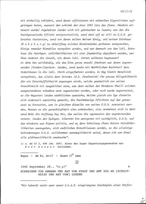 Schreiben von Karl Casati, Ambassador von Mailand-Spanien, an die Tagsatzungsgesandten...
