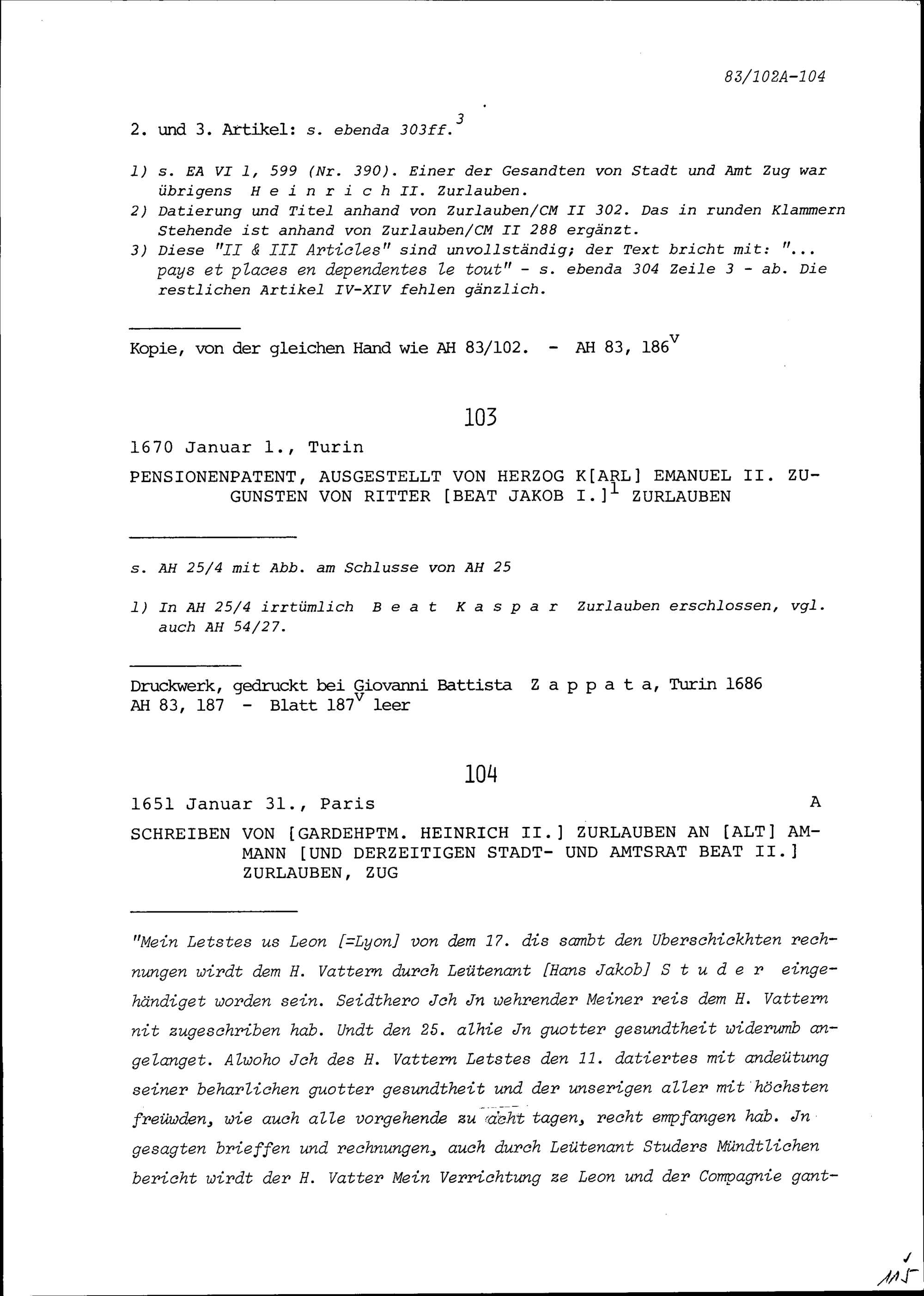 Schreiben von Heinrich II. Zurlauben, Gardehauptmann, an Beat II. Zurlauben, Altammann...