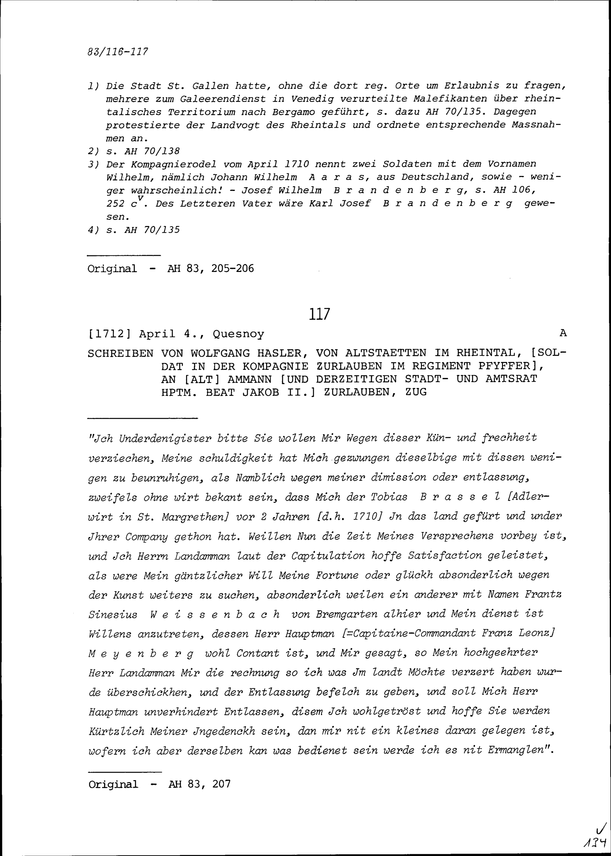 Schreiben von Fidel Zurlauben, Landvogt im Rheintal, an Beat Jakob II. Zurlauben, Stadt- und Amtrat Zug Hauptmann