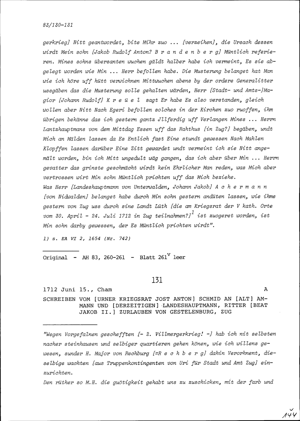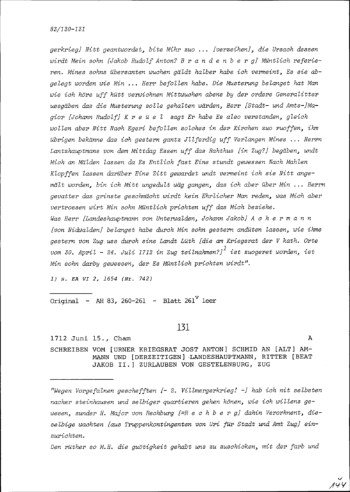 Schreiben von Karl Josef Brandenberg, Landesfähnrich, an Beat Jakob II. Zurlauben, Altammann und Landeshauptmann