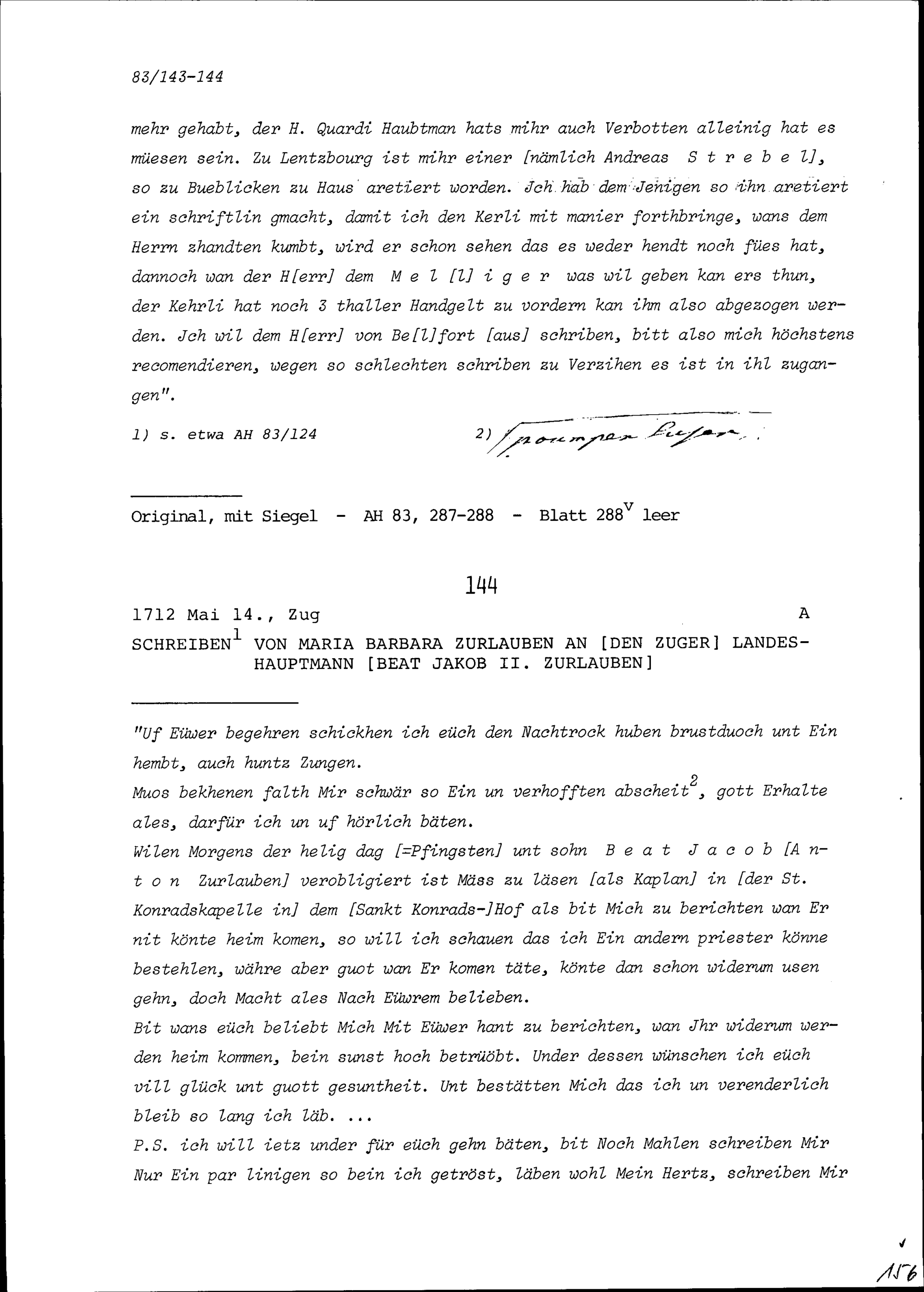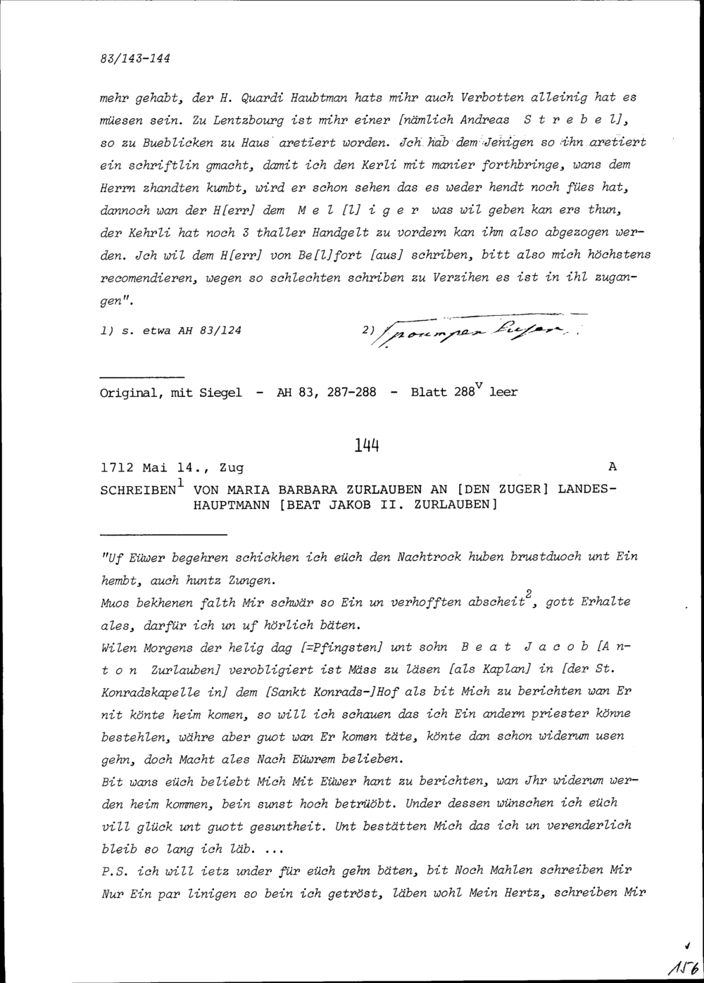 Schreiben von Beat Jakob Meyer, Gardeleutnant, an Beat Jakob II. Zurlauben, Altammann,...