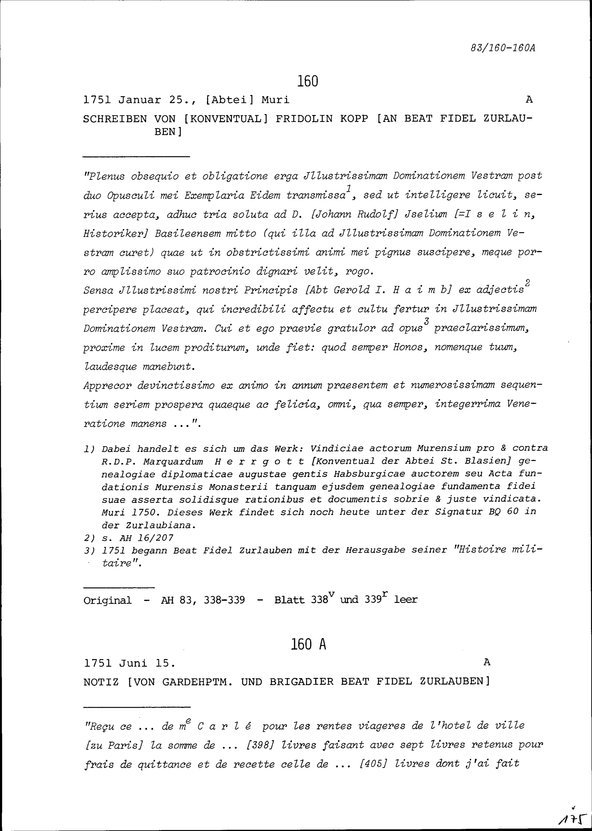 Notiz von Beat Fidel Zurlauben, Gardehauptmann und Brigadier