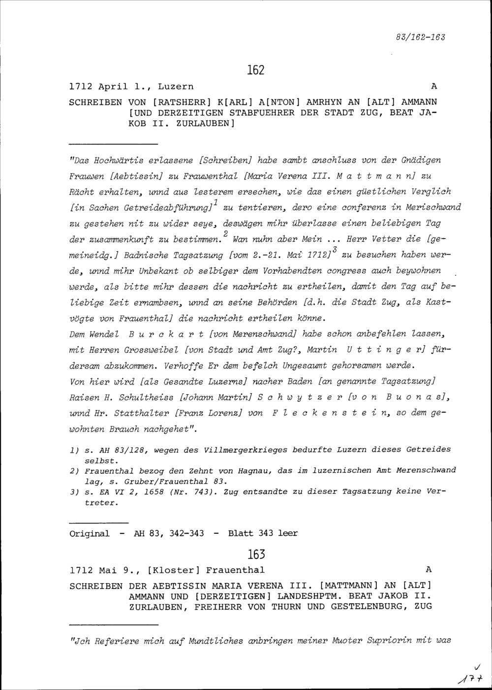 Schreiben von Maria Verena III. Mattmann, Äbtissin von Frauenthal, an Beat Jakob II. Zurlauben, Altammann und Landeshauptmann, Zug