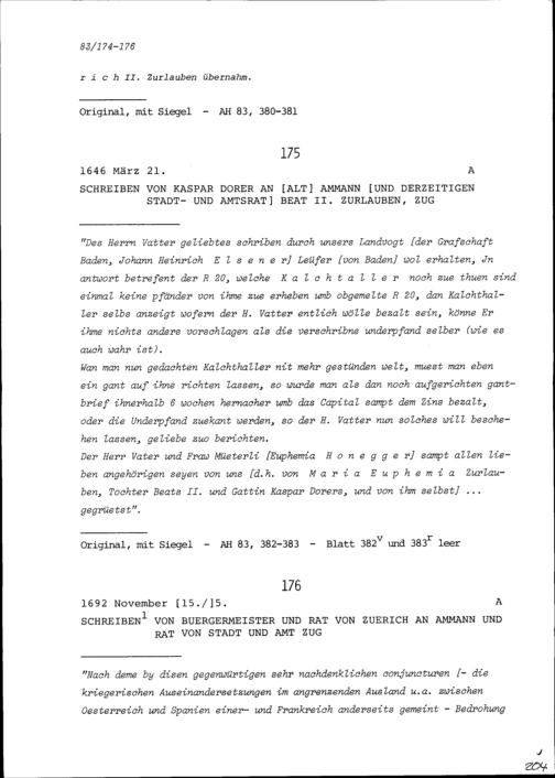 Schreiben des Bürgermeisters und Rats Zürich an Ammann und Rat von Stadt und Amt Zug