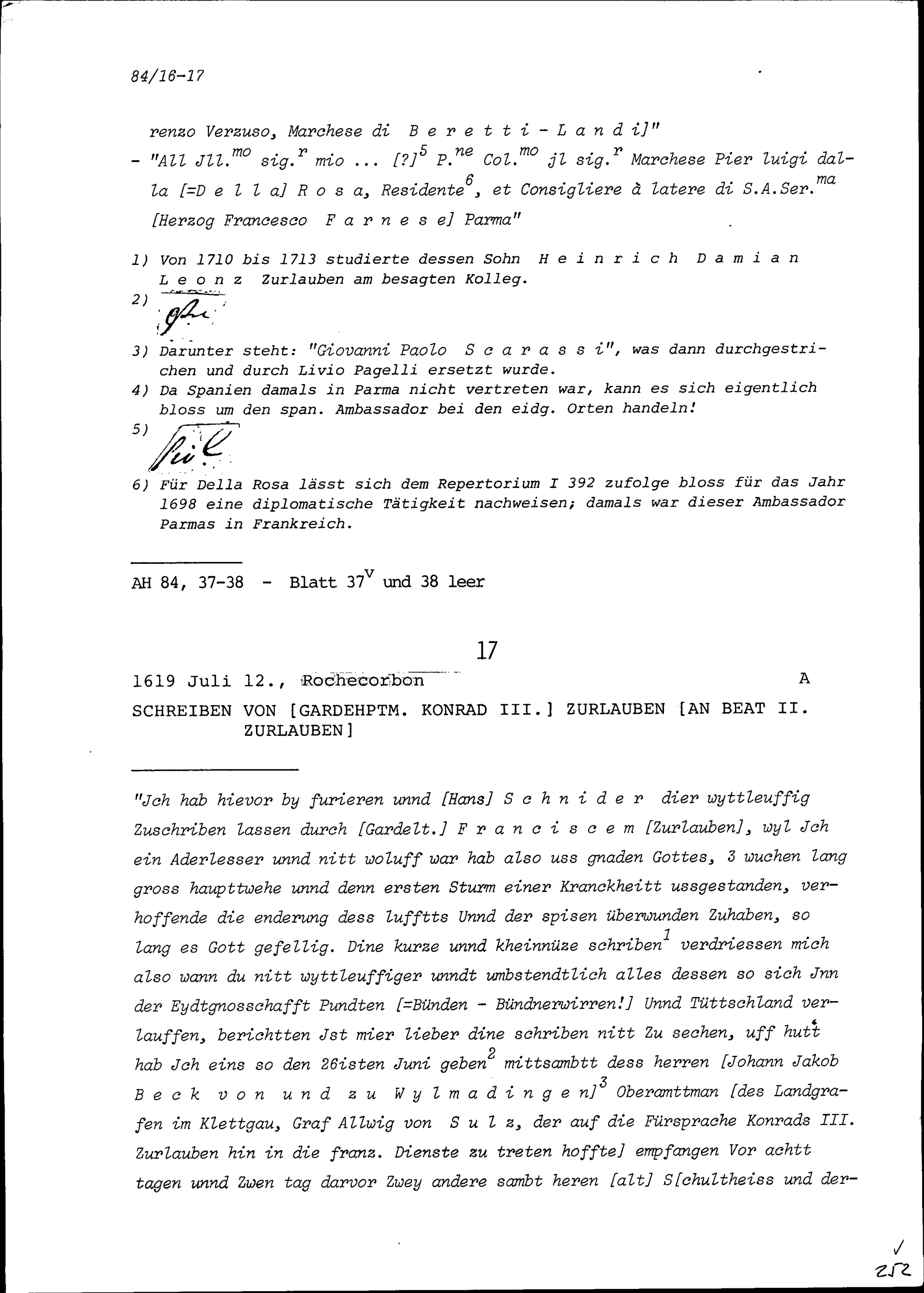 Notiz betreffend das Collegio dei nobili von Parma, aufgezeichnet von Beat Jakob II. Zurlauben