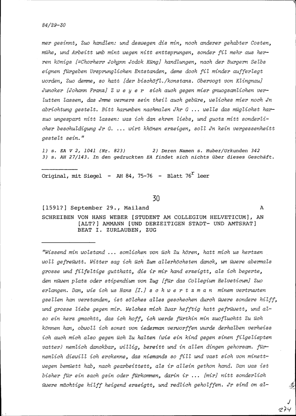 Schreiben von Gotthard Schmid, Kustos, an Beat II. Zurlauben, Stadt- und Amtrat Zug,...