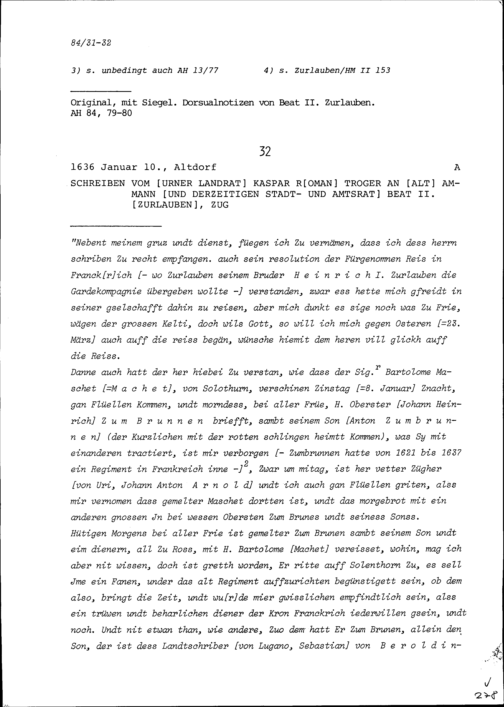 Schreiben von Barthélémy Rolland an Beat II. Zurlauben, Ammann und Hauptmann, Zug