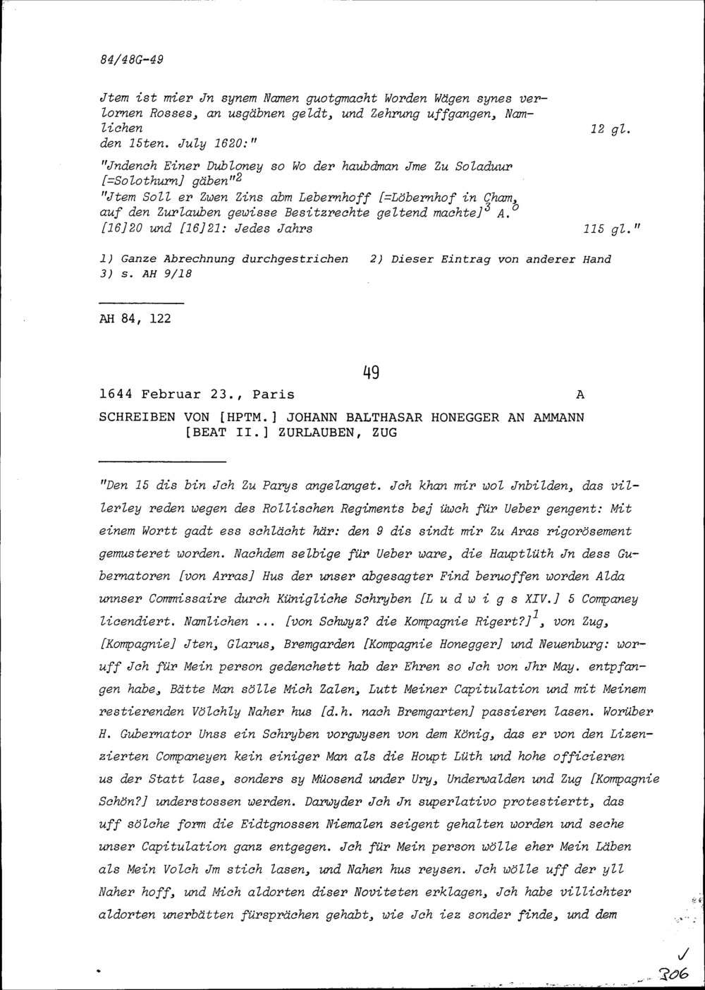 Abrechnung von Konrad III. Zurlauben mit Paul Bengg, Statthalter von Zug und Hauptmann, teilweise aufgezeichnet von Beat II. Zurlauben