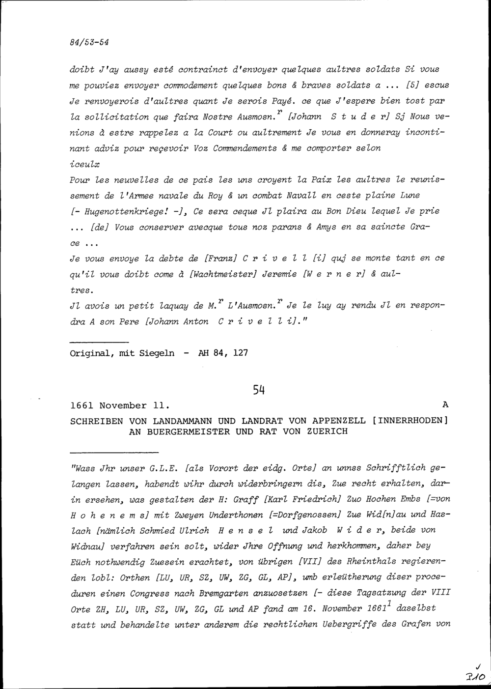 Schreiben von Franz Zurlauben, Gardehauptmann, an Konrad III. Zurlauben, Altammann...