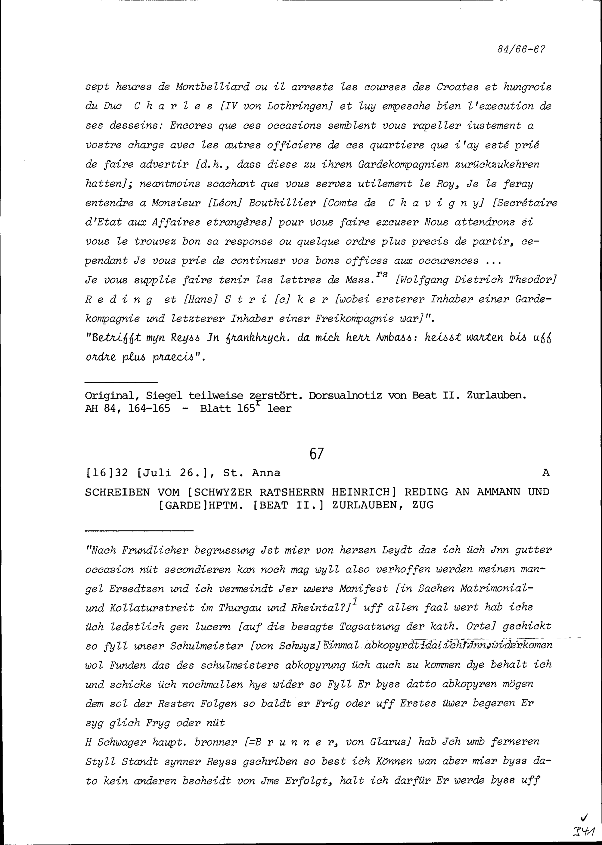 Schreiben von Blaise Méliand, Ambassador von Frankreich, an Beat II. Zurlauben, Ammann und Hauptmann, Zug