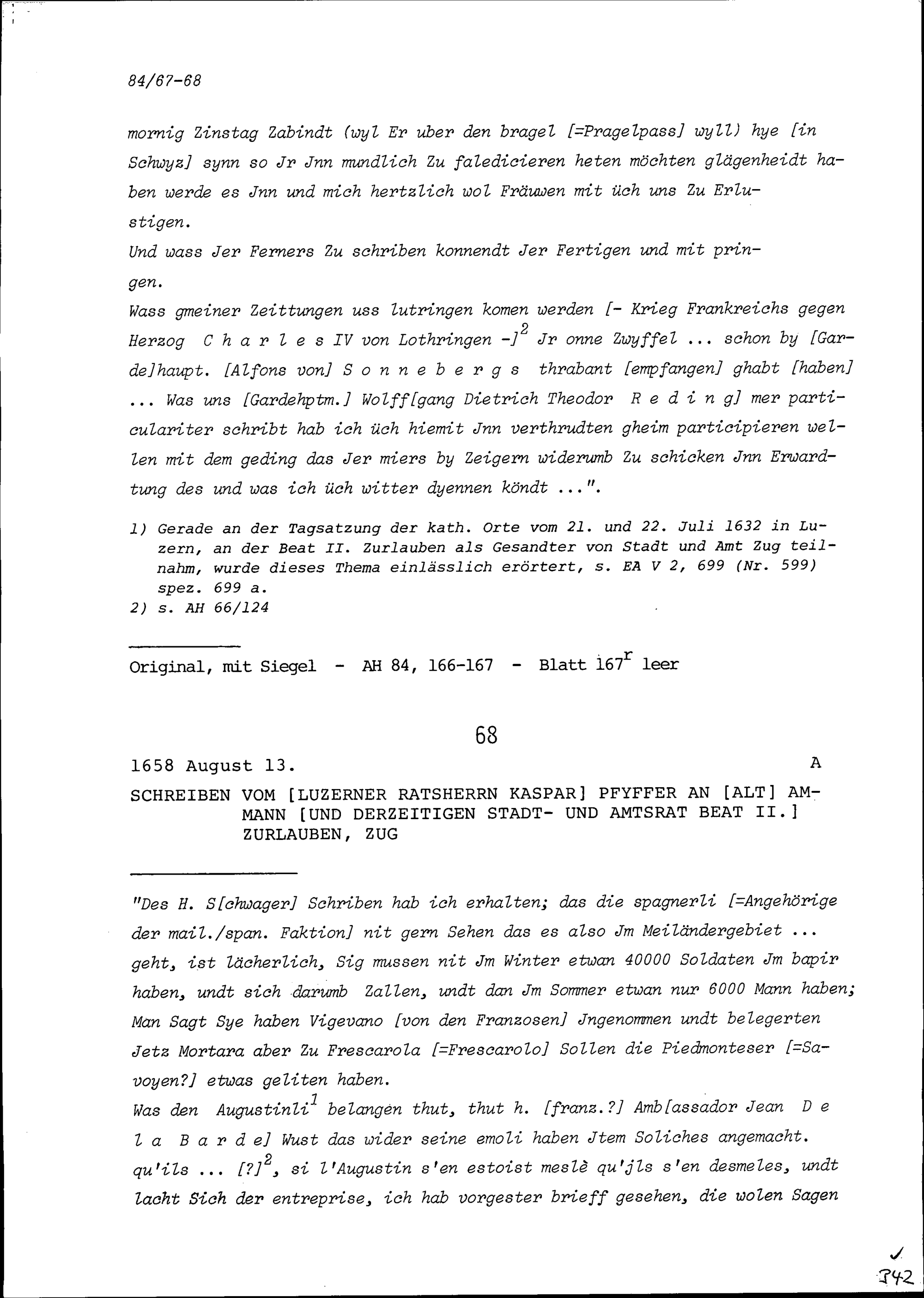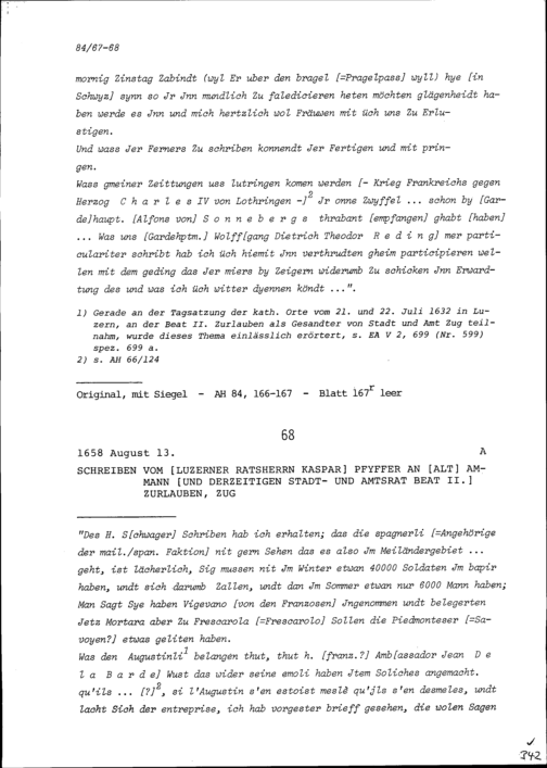 Schreiben von Heinrich Reding, Ratsherr Schwyz, an Beat II. Zurlauben, Ammann und Gardehauptmann, Zug