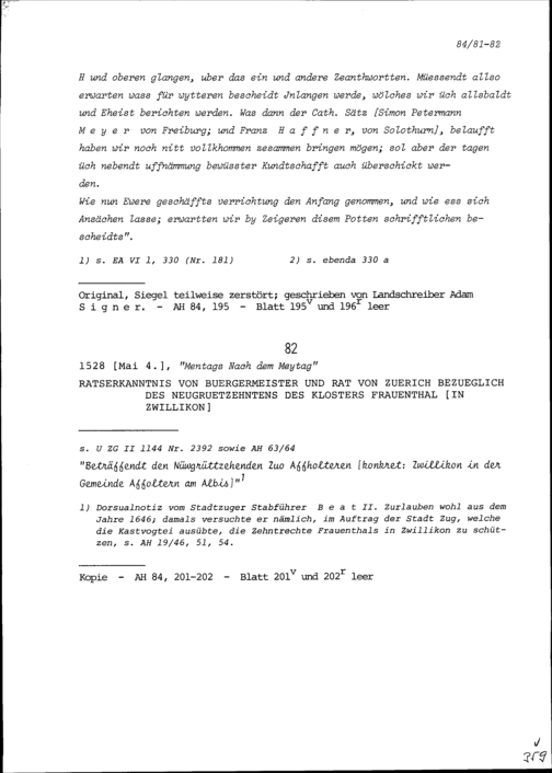 Schreiben des Ammanns und Rats von Stadt und Amt Zug an Beat II. Zurlauben, Stadt- und Amtrat und Tagsatzungsgesandter, und an Jakob Andermatt, Stadt- und Amtrat und Tagsatzungsgesandter, an der Friedenskonferenz nach dem Villmergerkrieg vom 19. April bis 14. Juni 1656 in Baden
