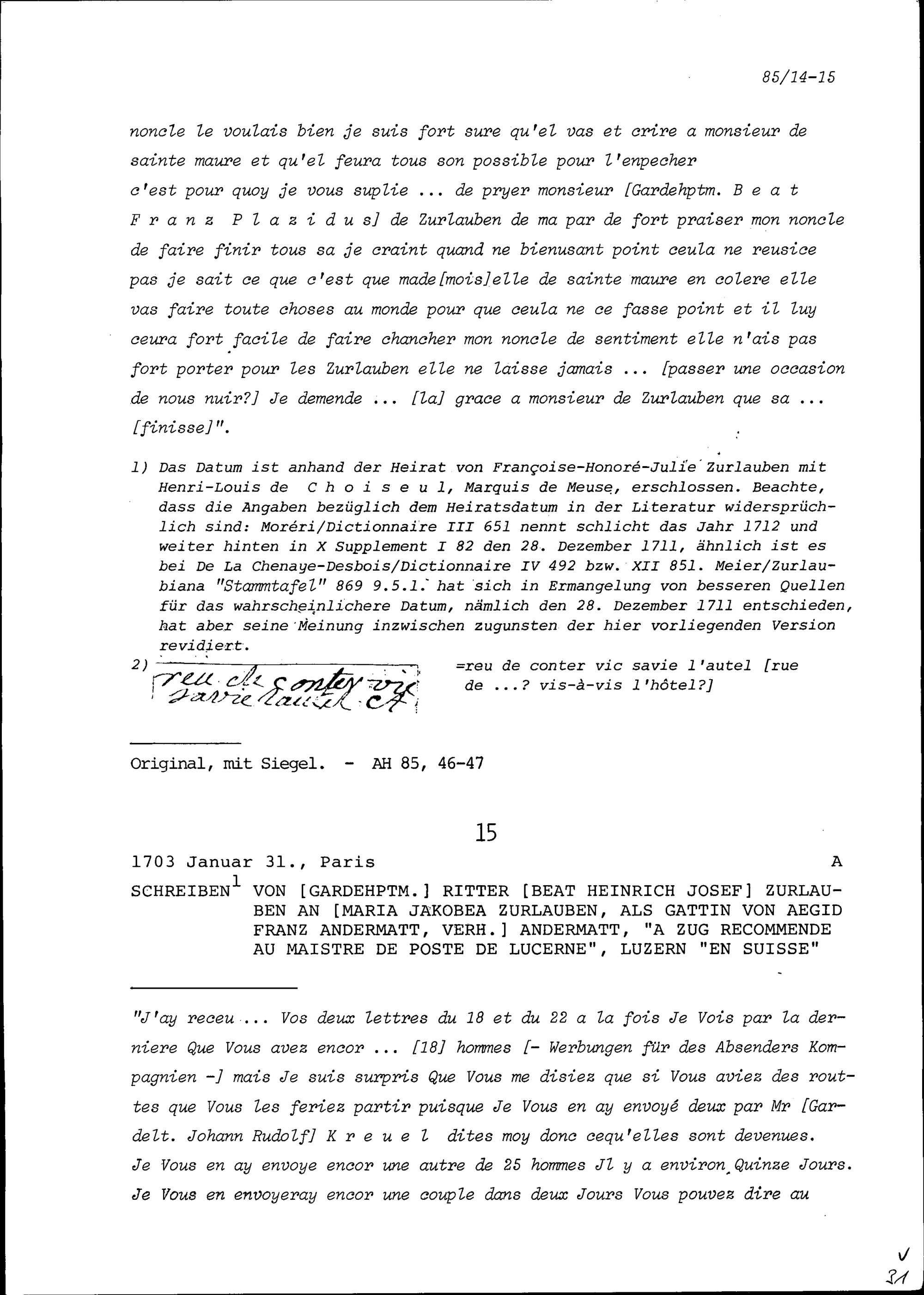 Schreiben von Françoise-Honorée-Julie Zurlauben an Maria Jakobea Zurlauben, Paris