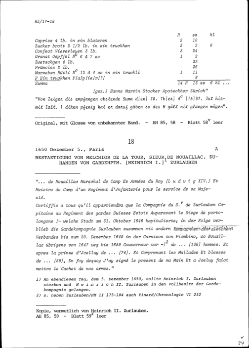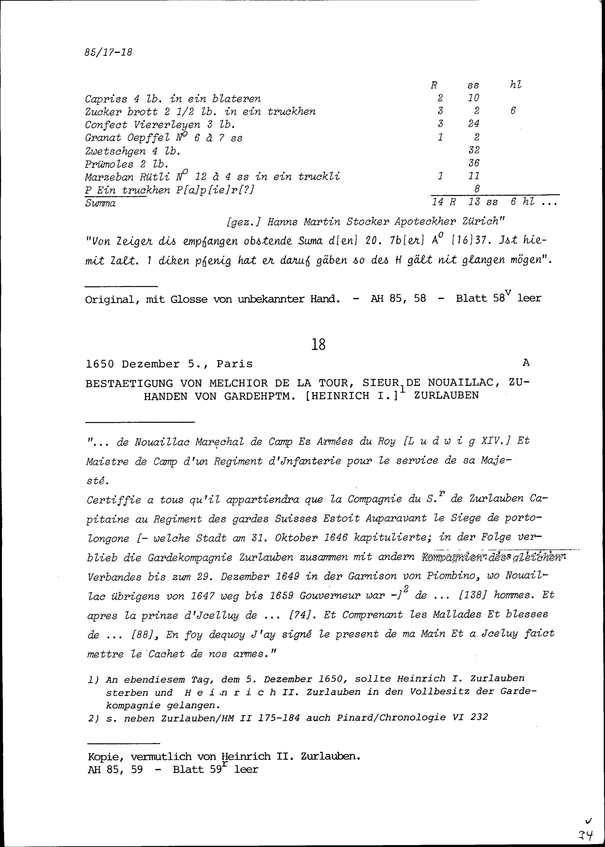 Rechnung für Beat II. Zurlauben, ausgestellt von Hans Martin Stocker, Zürcher Apotheker