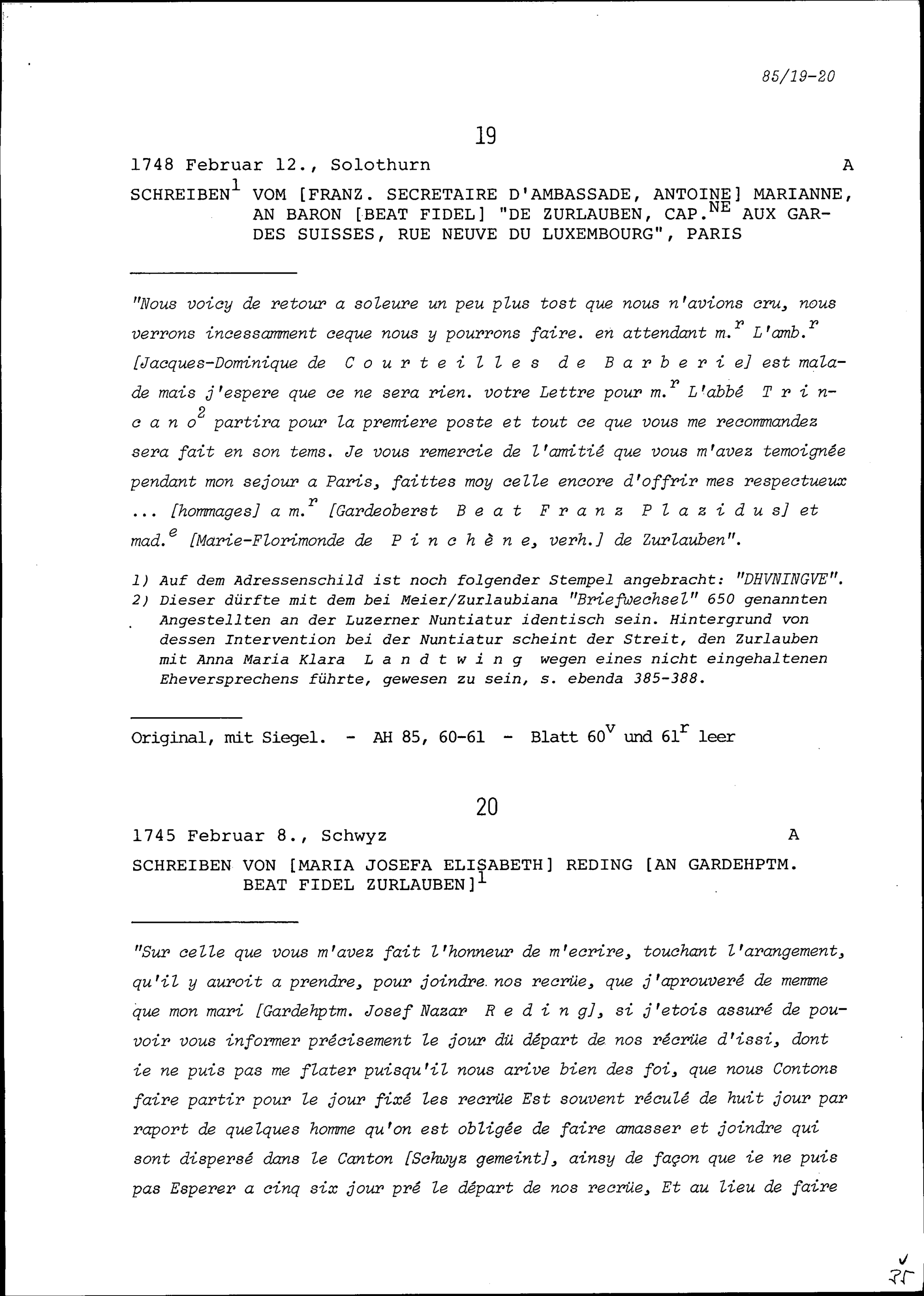 Schreiben von Maria Josefa Elisabeth Reding an Beat Fidel Zurlauben, Gardehauptmann