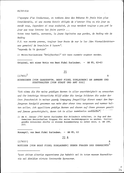Schreiben von Maria Josefa Elisabeth Reding an Beat Fidel Zurlauben, Gardehauptmann