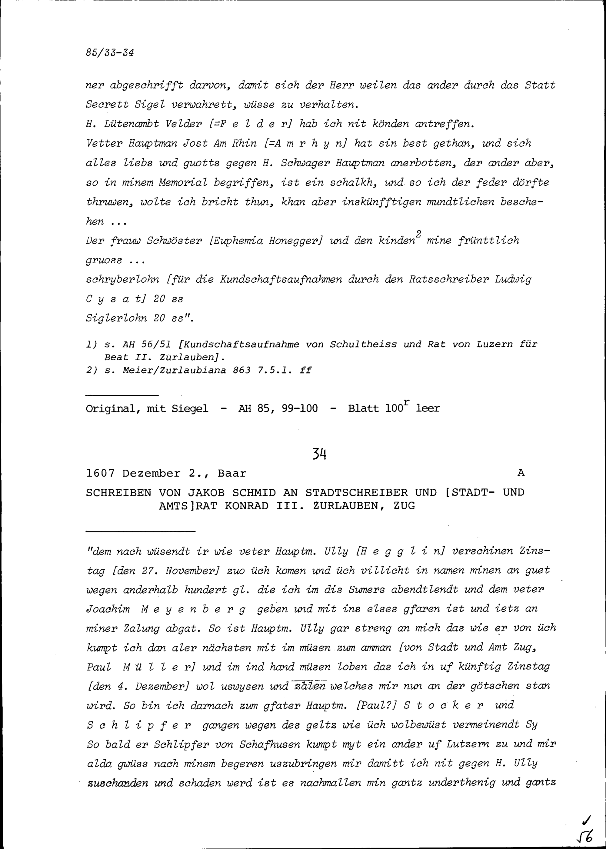 Schreiben von Balthasar Pfyffer, Apotheker, an Beat II. Zurlauben, Stadt- und Amtrat und Gardehauptmann, Zug