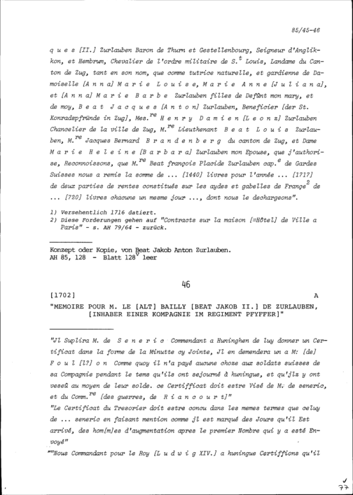 Quittung zuhanden von Beat Franz Plazidus Zurlauben, Gardehauptmann, ausgestellt von Maria Barbara Zurlauben und deren Kindern