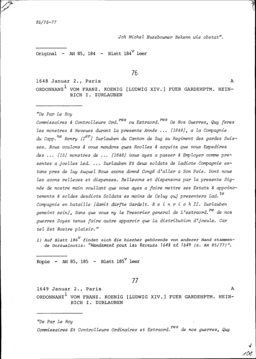Ordonnanz von Ludwig XIV., König von Frankreich, für Heinrich I. Zurlauben, Gardehauptmann