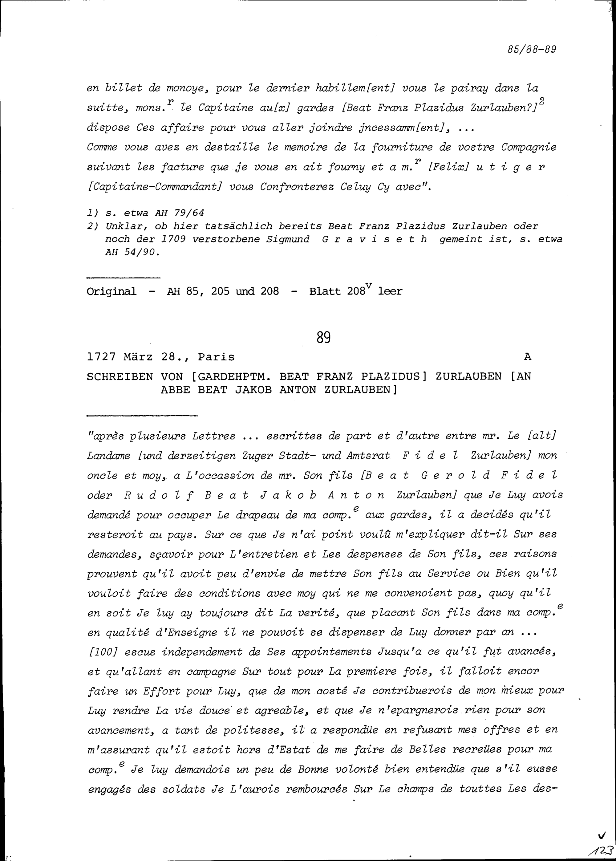 Schreiben von NN Veron, Tuchhändlerin, an Beat Jakob II. Zurlauben, Hauptmann