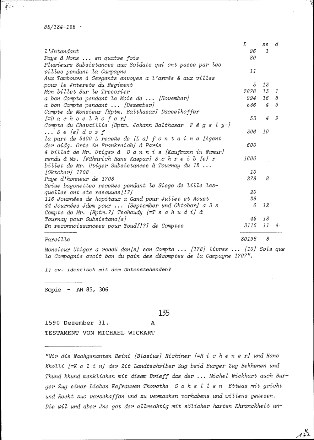 Abrechnung für die Kompanie von Beat Jakob II. Zurlauben, Hauptmann im Regiment Pfyffer