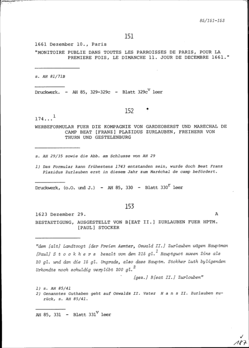Bestätigung für Paul Stocker, Hauptmann, ausgestellt von Beat II. Zurlauben