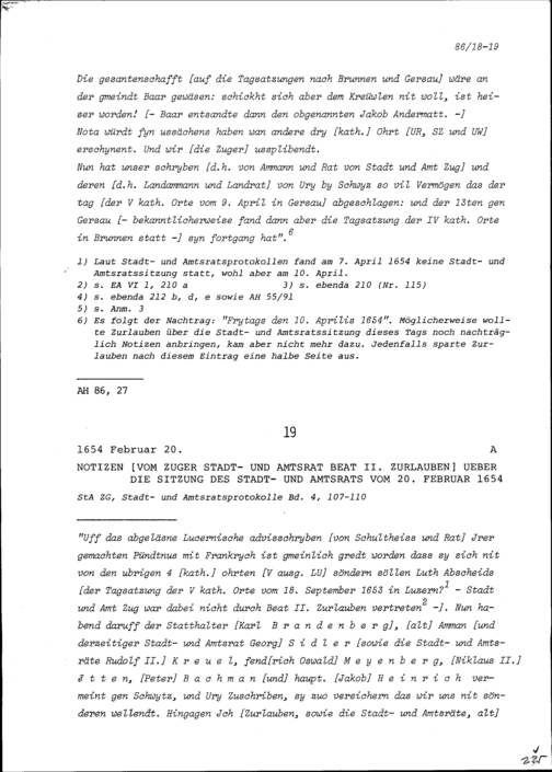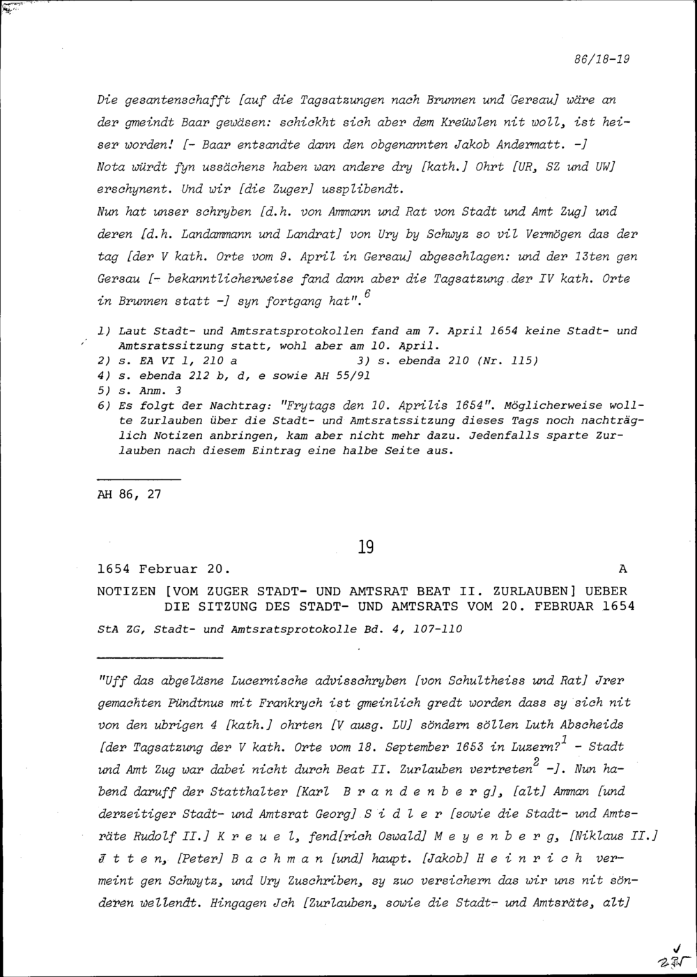 Notiz von Beat II. Zurlauben, Stadt- und Amtrat Zug, über die Sitzung des Stadt- und Amtrats vom 7. April 1654