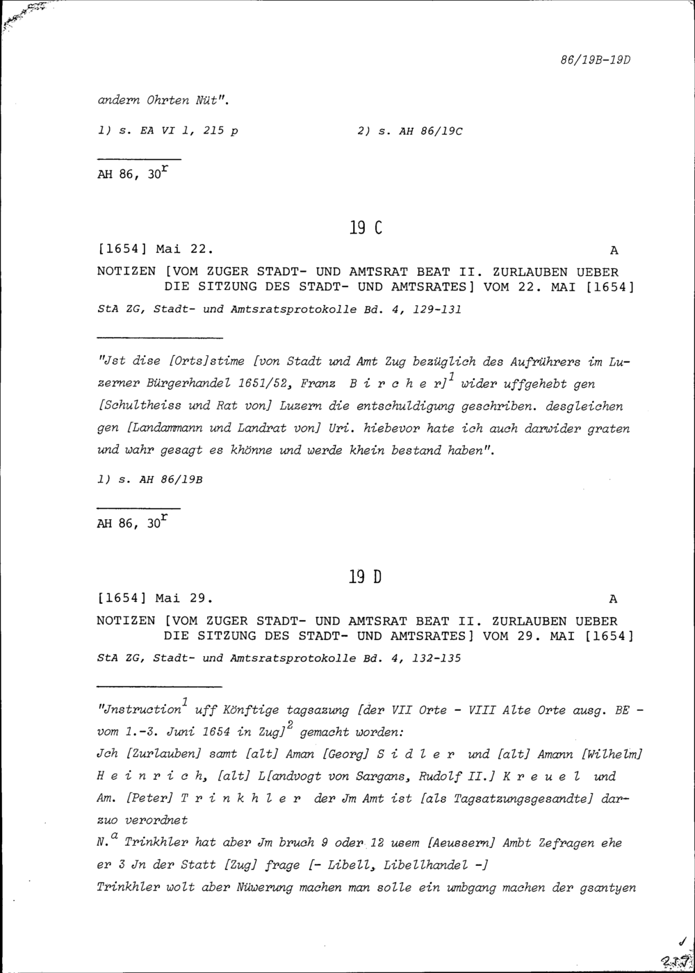 Notiz von Beat II. Zurlauben, Stadt- und Amtrat Zug, über die Sitzung des Stadt- und Amtrats vom 29. Mai 1654