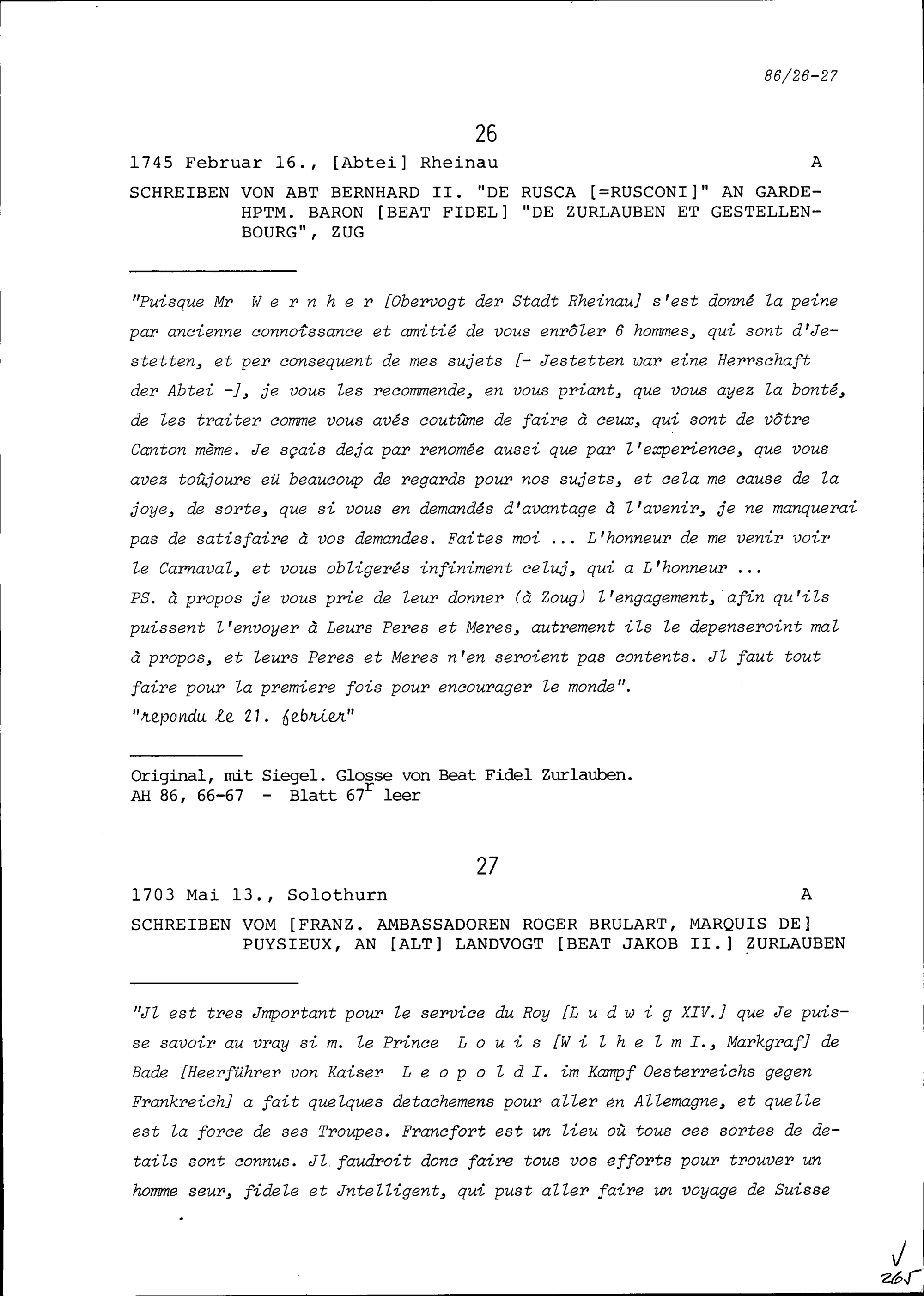 Schreiben von Roger Brûlart, Marquis de Puysieux, Ambassador von Frankreich, an Beat Jakob II. Zurlauben, Altlandvogt