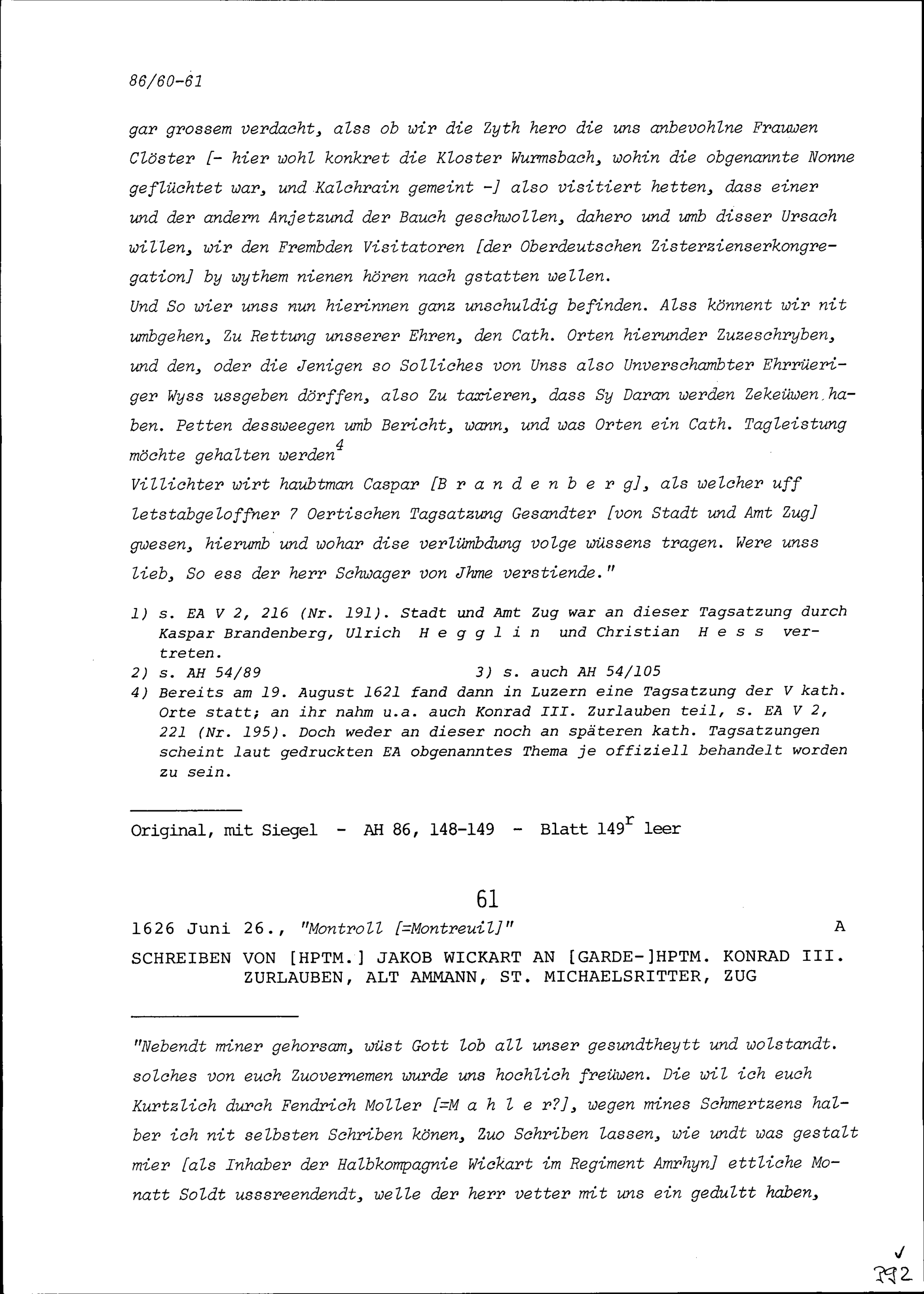 Schreiben von Peter II. Schmid, Abt von Wettingen, an Konrad III. Zurlauben, Altammann...
