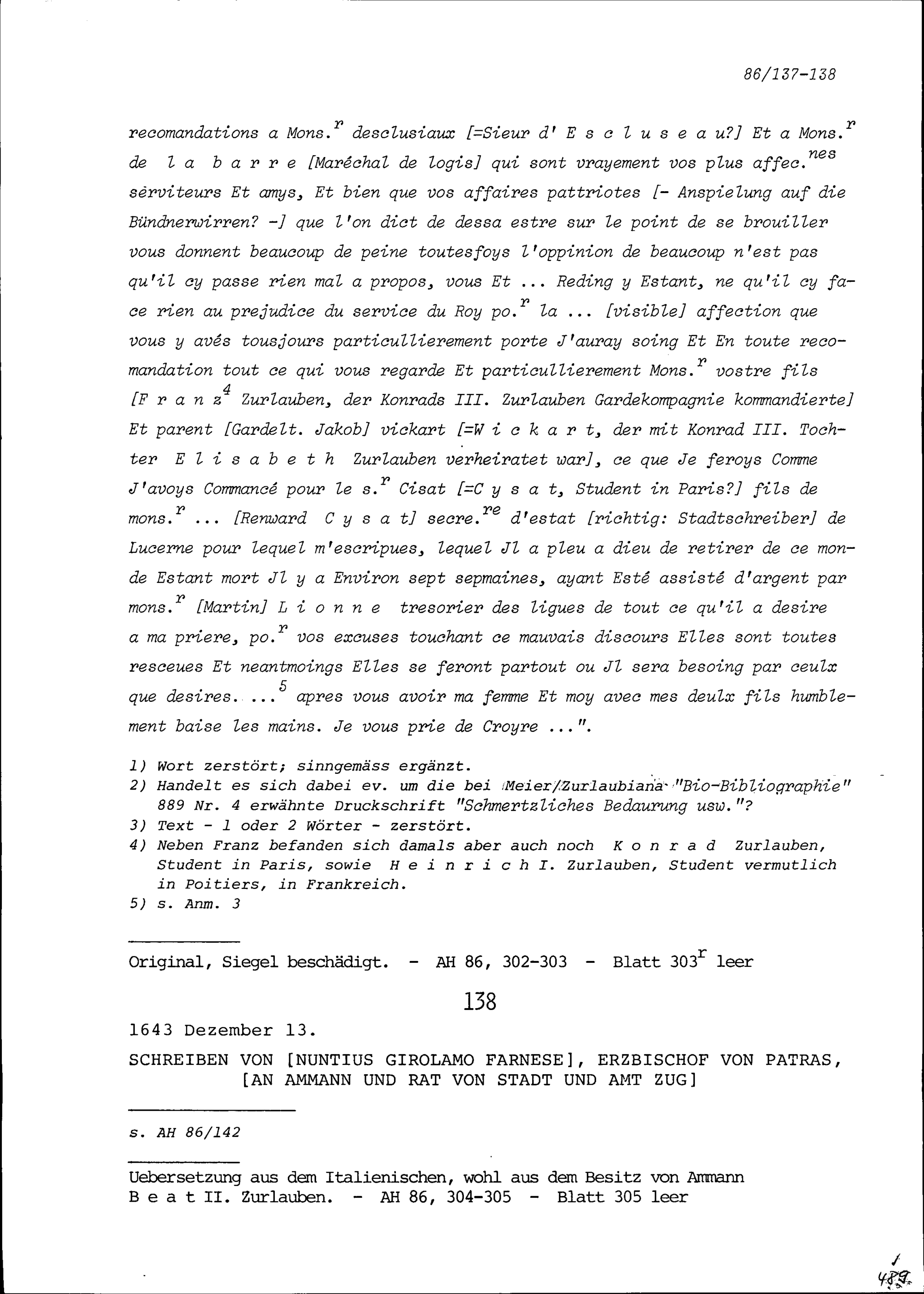 Schreiben von Abraham de Poncher, französischer Dolmetscher, an Konrad III. Zurlauben, Altammann und Stadt- und Amtrat, Zug