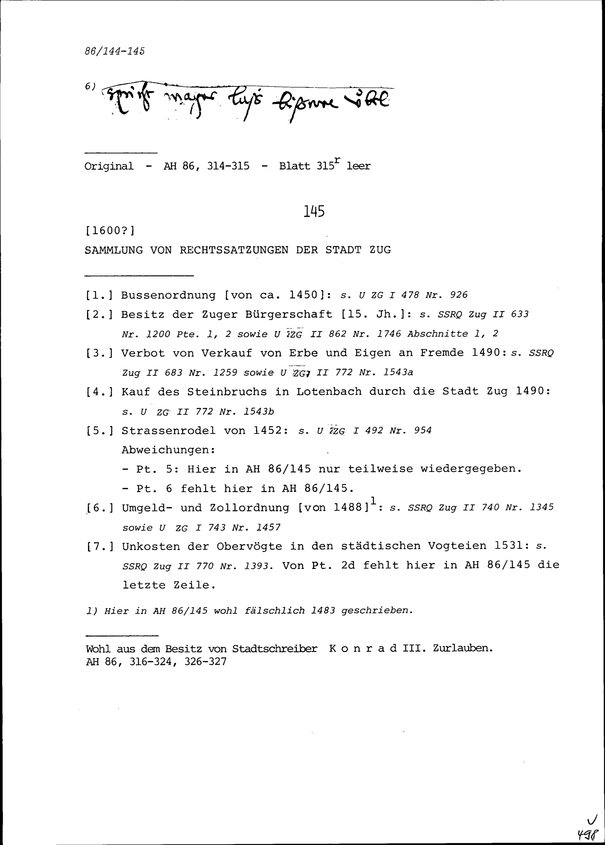 Schreiben von Jakob von Sonnenberg, Ratsherr an Konrad III. Zurlauben, Altammann...