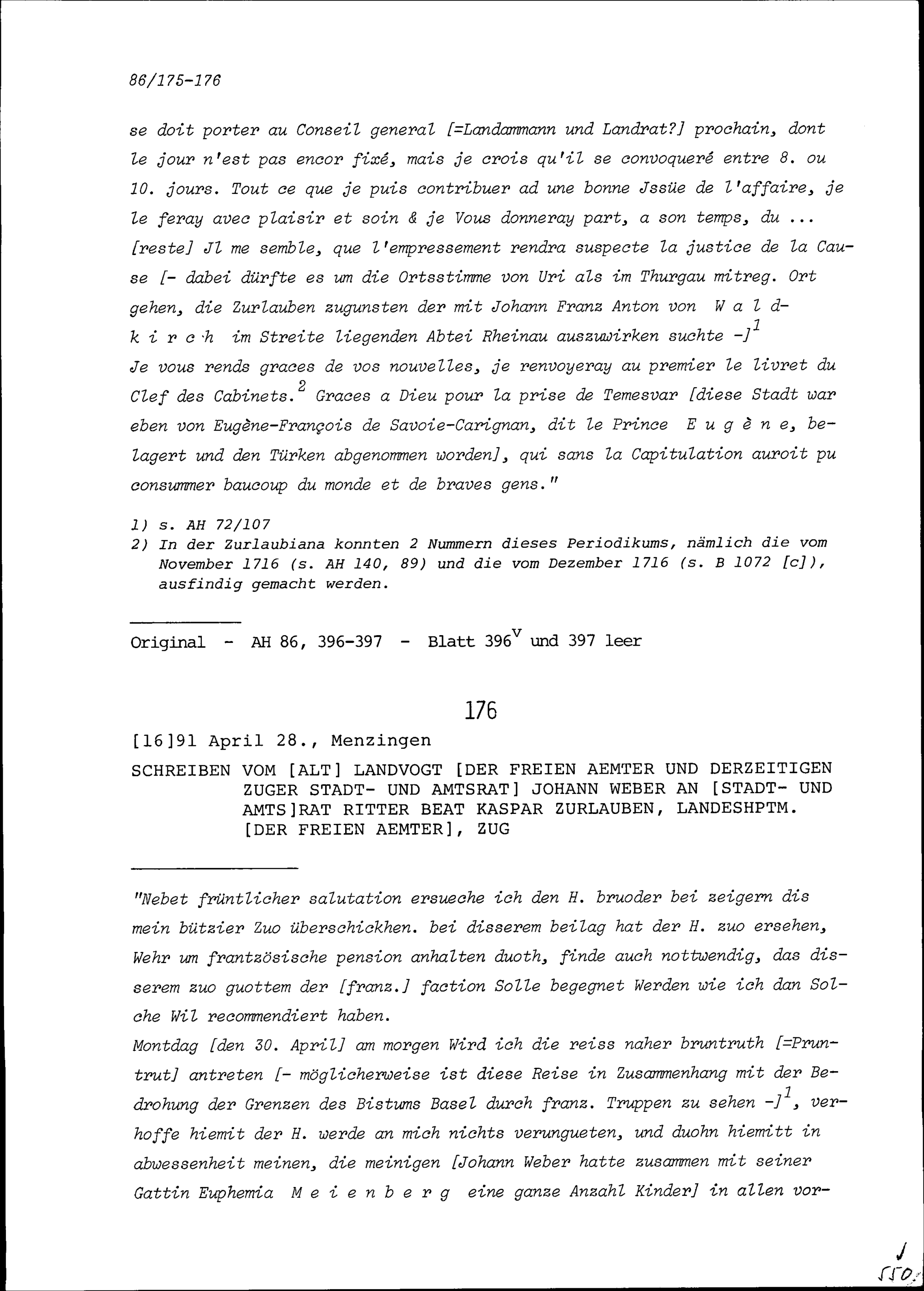 Schreiben von Josef Anton Püntener, Landrat Uri, an Beat Jakob II. Zurlauben, Stadt- und Amtrat Zug