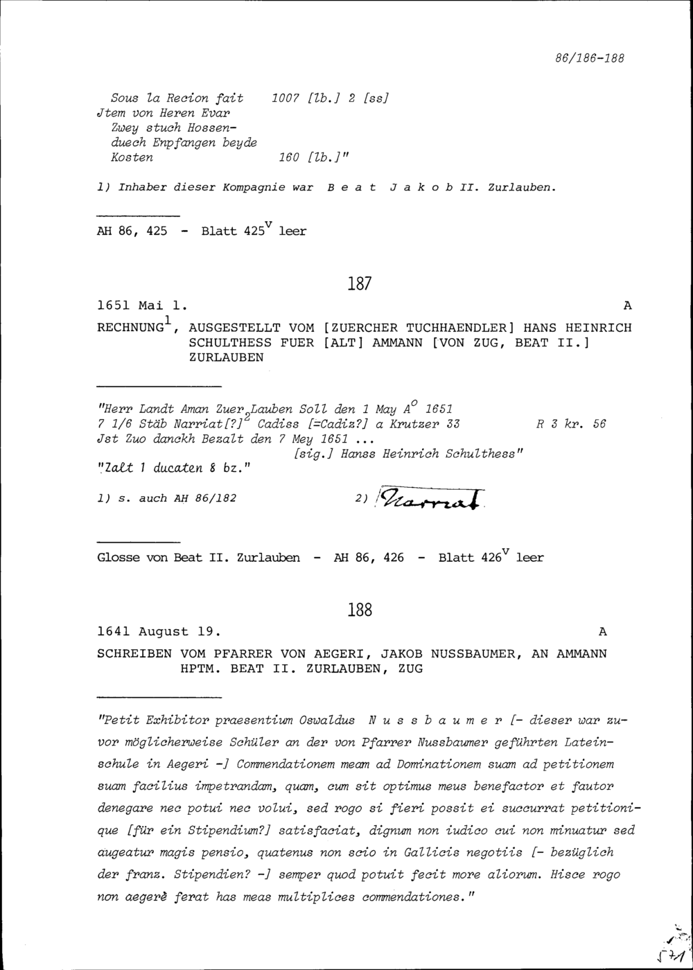 Abrechnung für die Kompanie Zurlauben für Gratifikation, Sold, Brot und Montur, aufgezeichnet von Franz Leonz Meyenberg, Kommandant