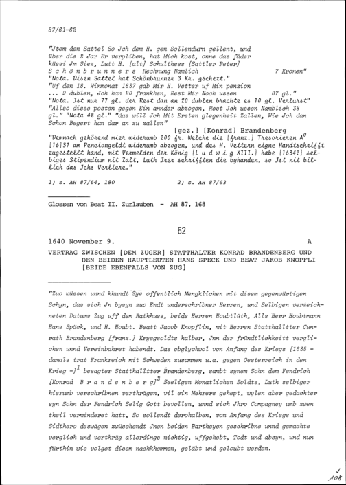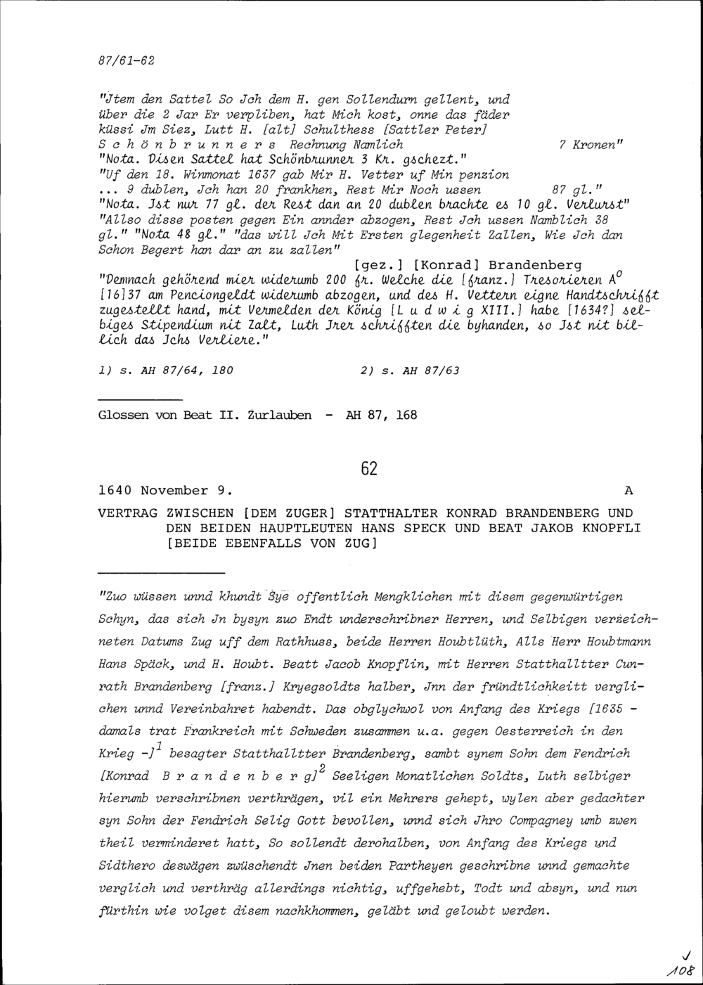 Abrechnung von Konrad Brandenberg, Statthalter Zug, mit Beat II. Zurlauben, Stadt- und Amtrat Zug