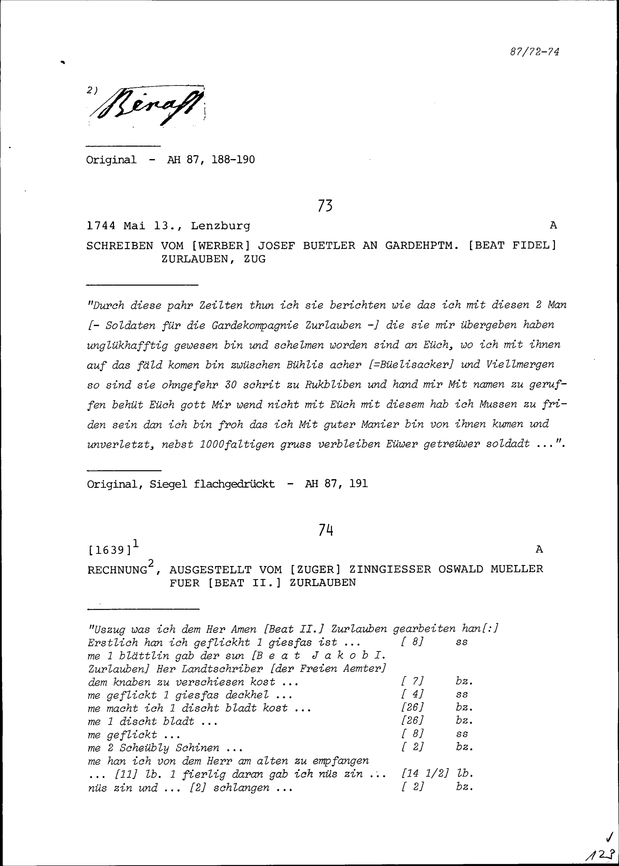 Rechnung für Beat II. Zurlauben, ausgestellt von Oswald Müller, Zuger Zinngiesser