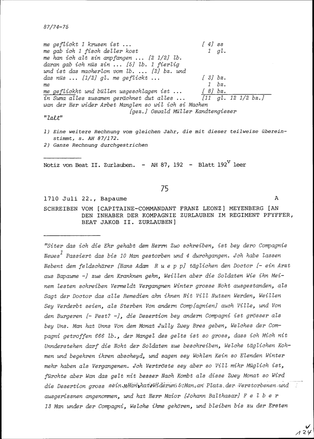 Rechnung für Beat II. Zurlauben, ausgestellt von Oswald Müller, Zuger Zinngiesser