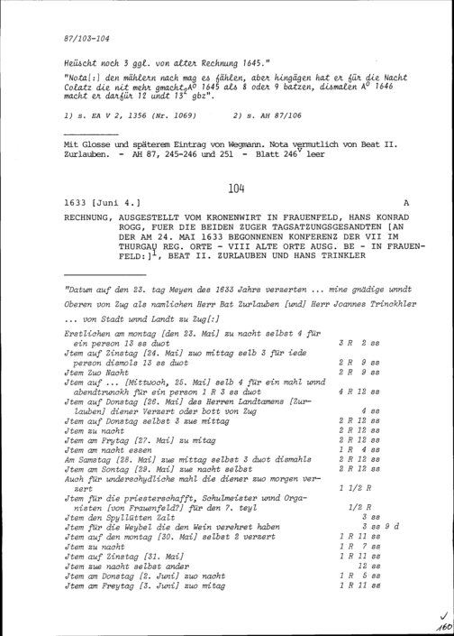 Rechnung für den Zuger Tagsatzungsgesandter an der Jahrrechnung in Baden, Beat II....