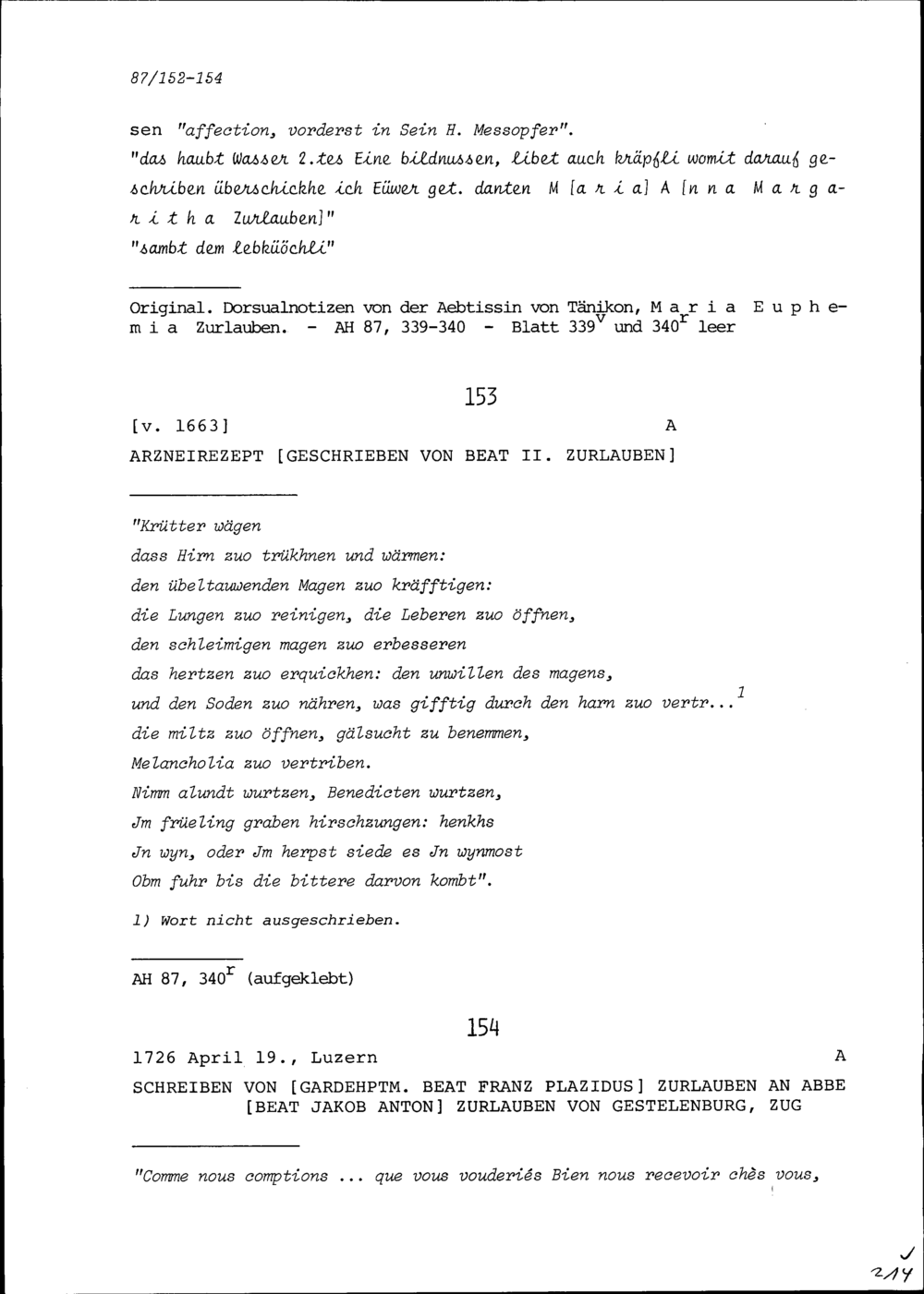 Schreiben von Beat Franz Plazidus Zurlauben, Gardehauptmann, an Beat Jakob Anton...