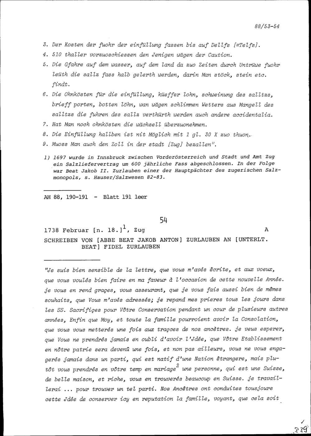 Bericht von Beat Jakob II. Zurlauben, Zuger Salzhändler, wegen Unkosten des Salzes