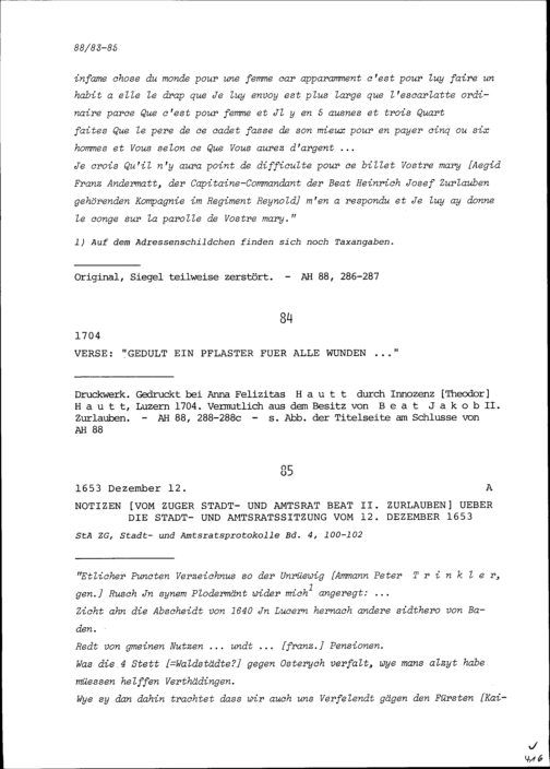 Notiz von Beat II. Zurlauben, Stadt- und Amtrat Zug, über die Stadt- und Amtratssitzung vom 12. Dezember 1653