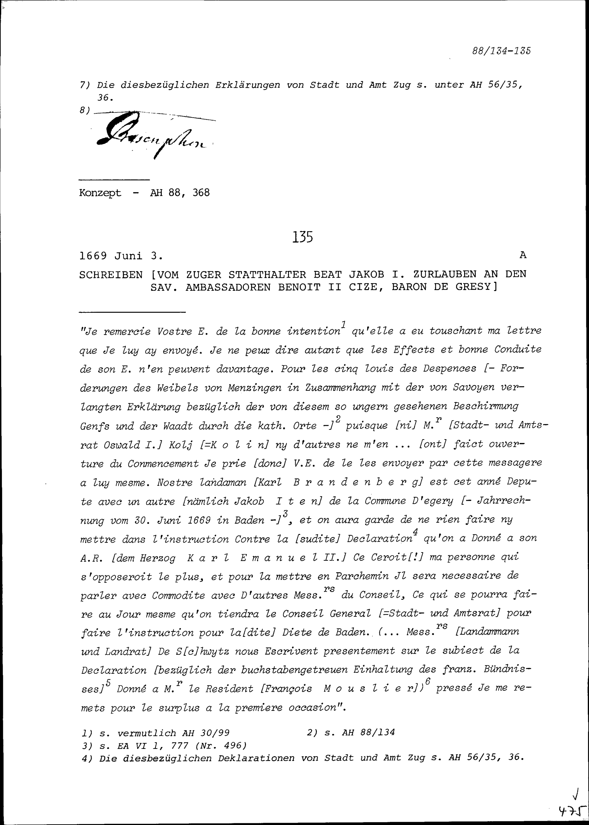 Schreiben von Beat Jakob I. Zurlauben, Statthalter Zug, an Benoît II. Cize, Baron...