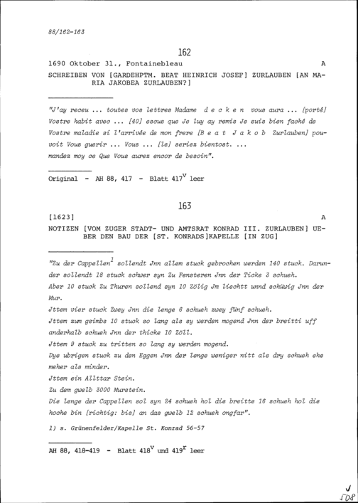 Notiz von Konrad III. Zurlauben, Stadt- und Amtrat Zug, über den Bau der Sankt Konradskapelle...