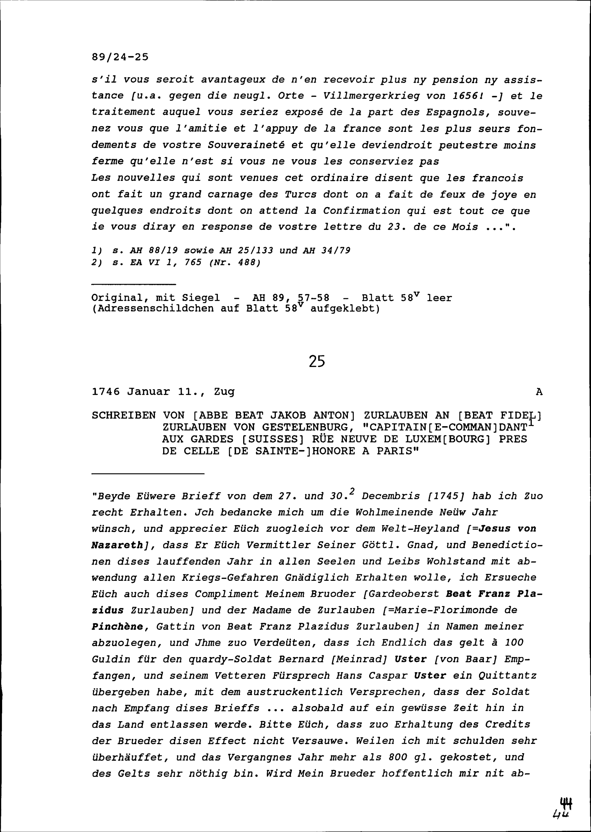 Schreiben von François Mouslier, Resident von Frankreich, an Beat Jakob I. Zurlauben, Statthalter, Zug