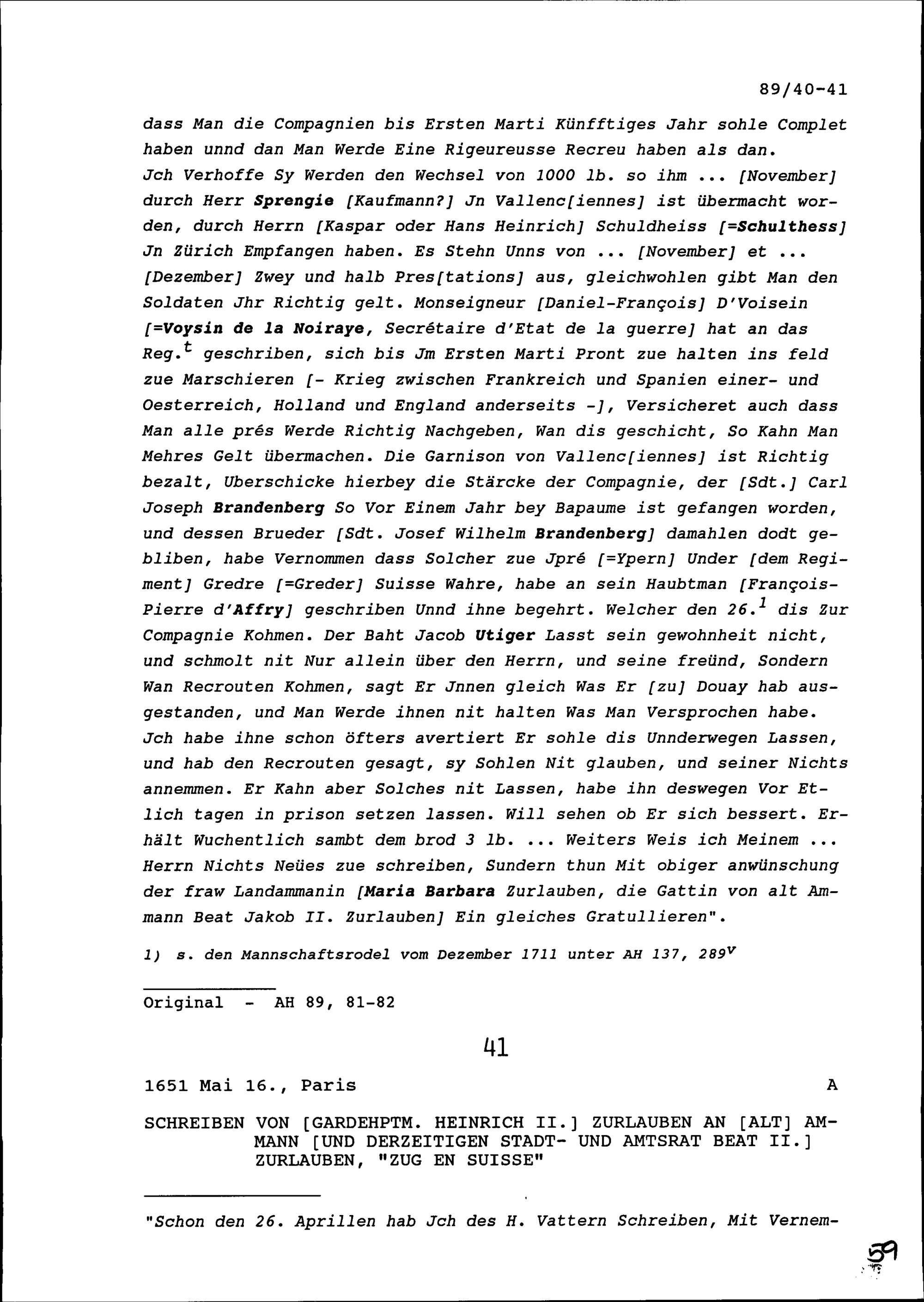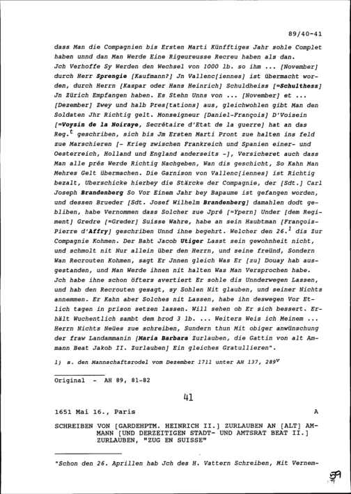 Schreiben von Franz Leonz Meyenberg, Kommandant der Kompanie Zurlauben im Regiment Pfyffer, an Beat Jakob II. Zurlauben, Kompanieinhaber