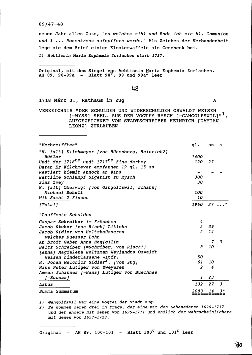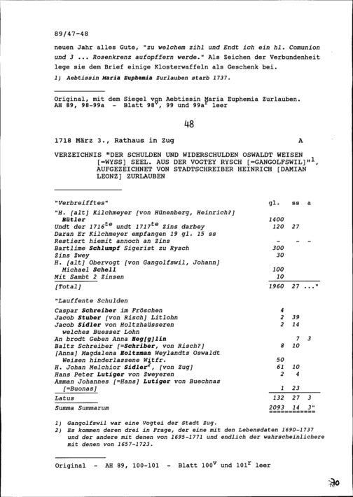 Schreiben von Maria Aurelia Sibilla Märklin, Klosterfrau im Kloster Tänikon, an Beat Jakob Anton Zurlauben, Priester und Geistlicher Vater, Zug