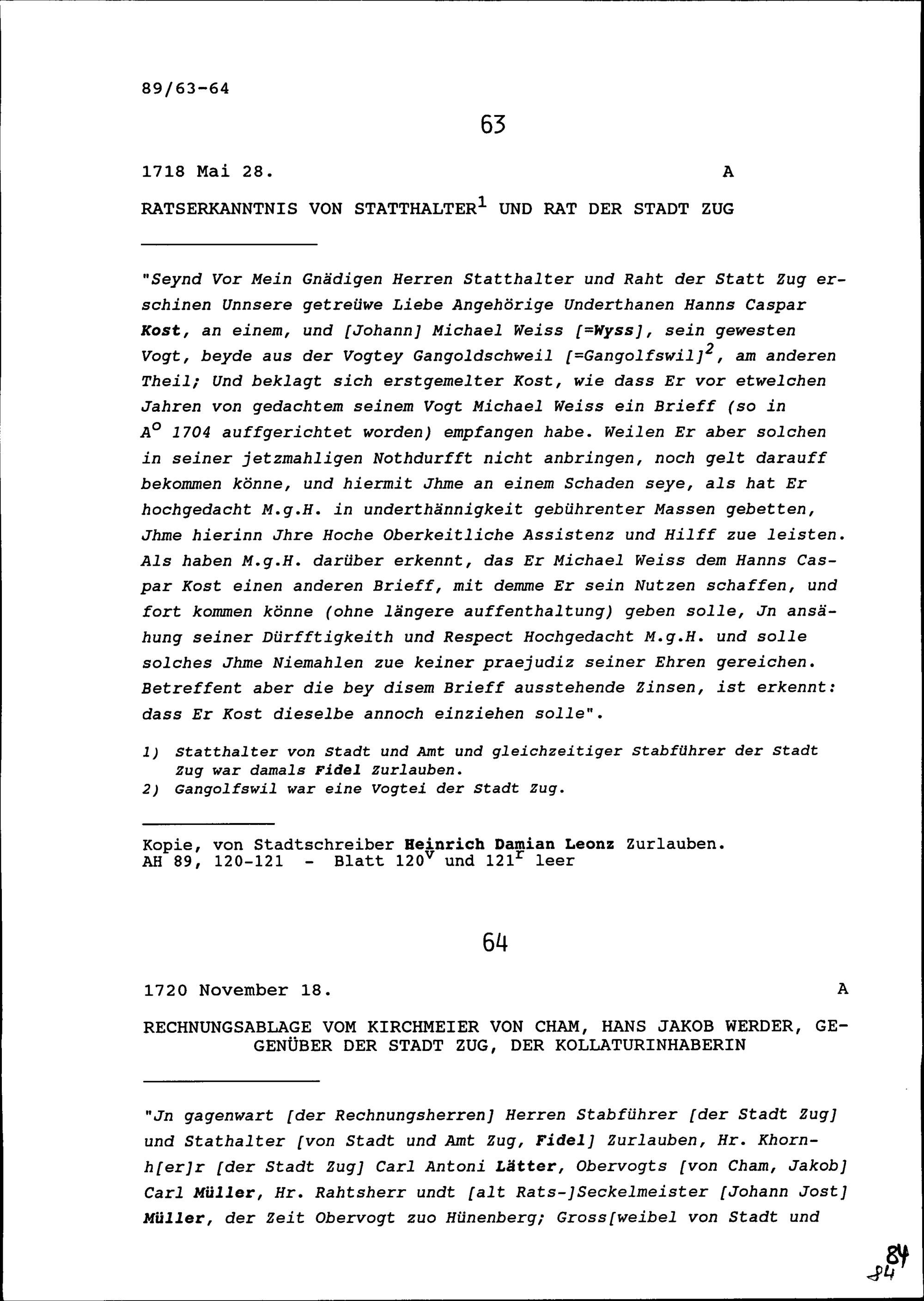 Rechnungsablage von Hans Jakob Werder, Kirchmeier von Cham, gegenüber der Stadt Zug, der Kollaturinhaberin