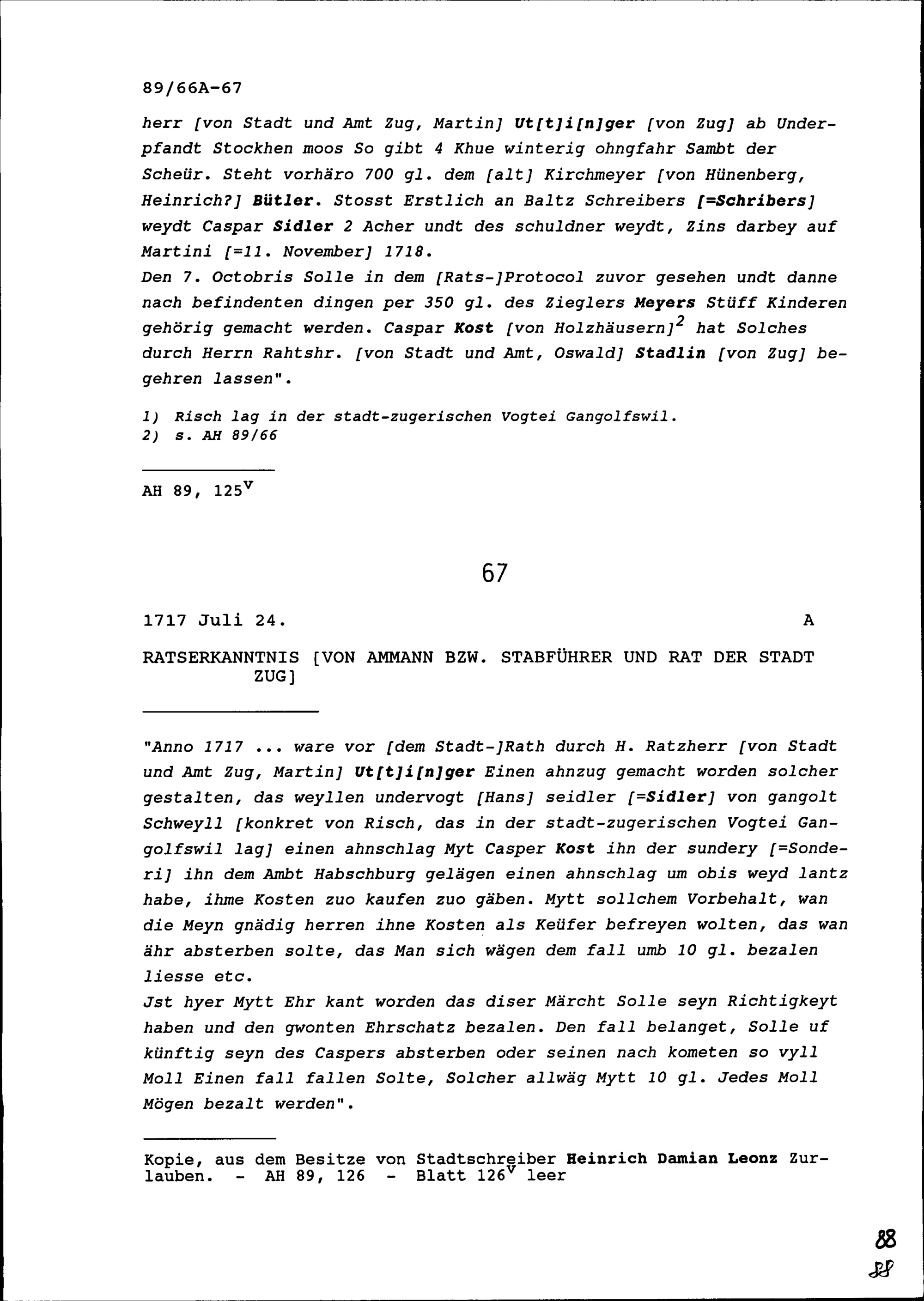 Auszug von Heinrich Damian Leonz Zurlauben, Stadtschreiber, aus dem Ratsprotokoll der Stadt Zug