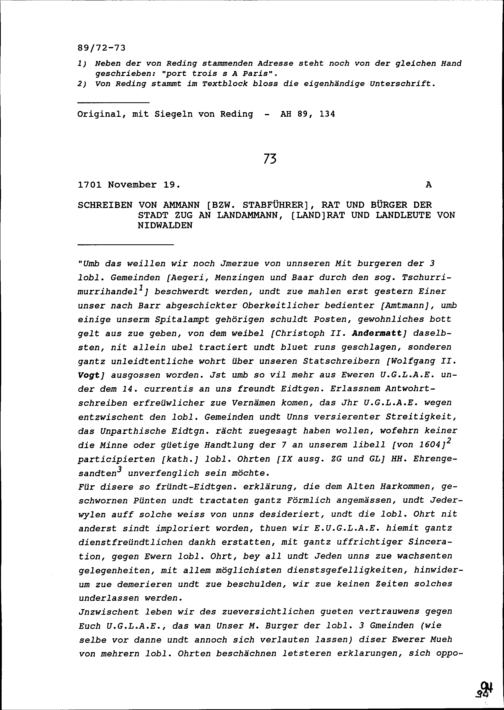 Schreiben von Beat II. Zurlauben und von Wolfgang Dietrich Theodor Reding, beide...