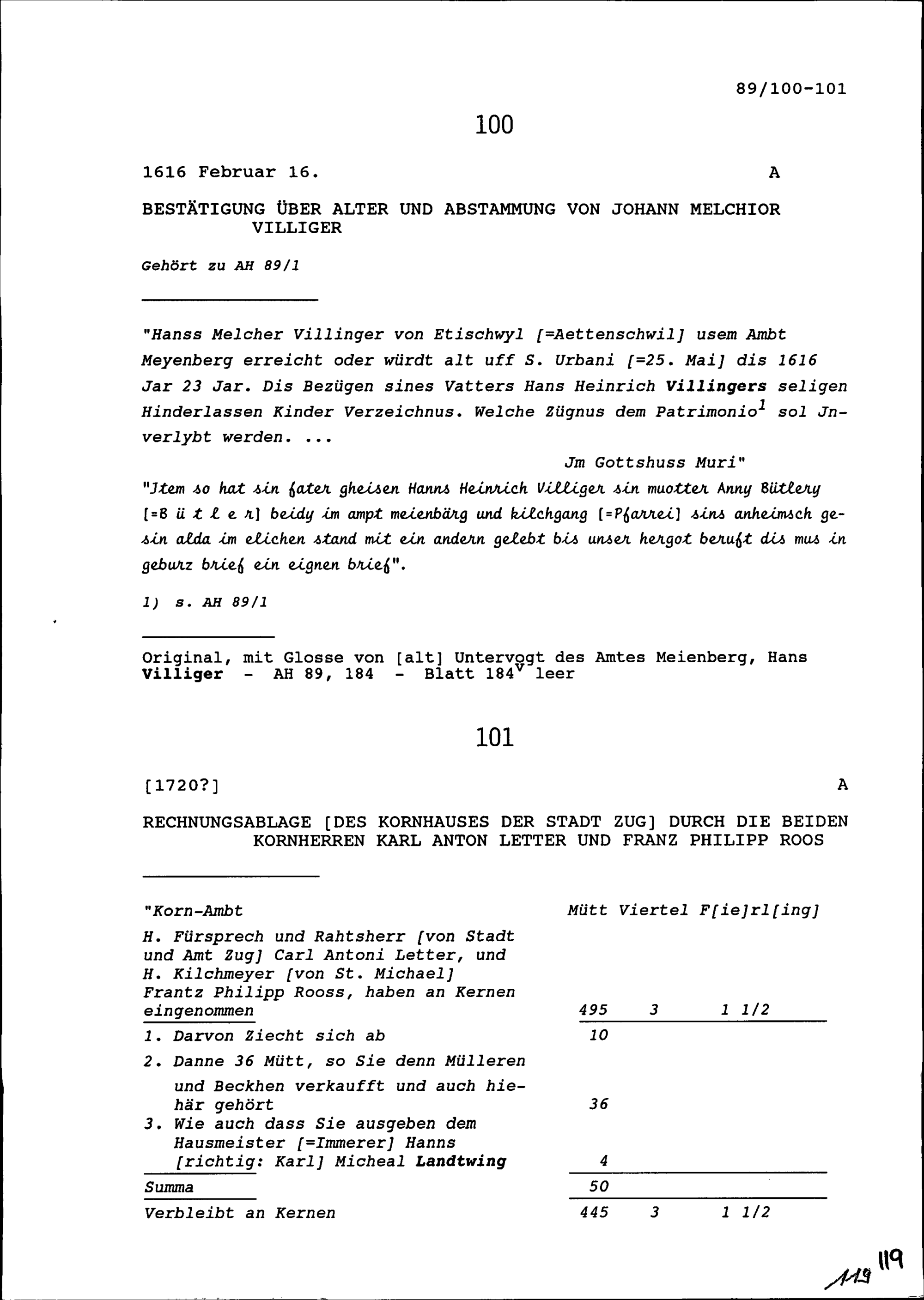 Rechnungsablage des Kornhauses der Stadt Zug durch Karl Anton Letter, Kornherr, und...
